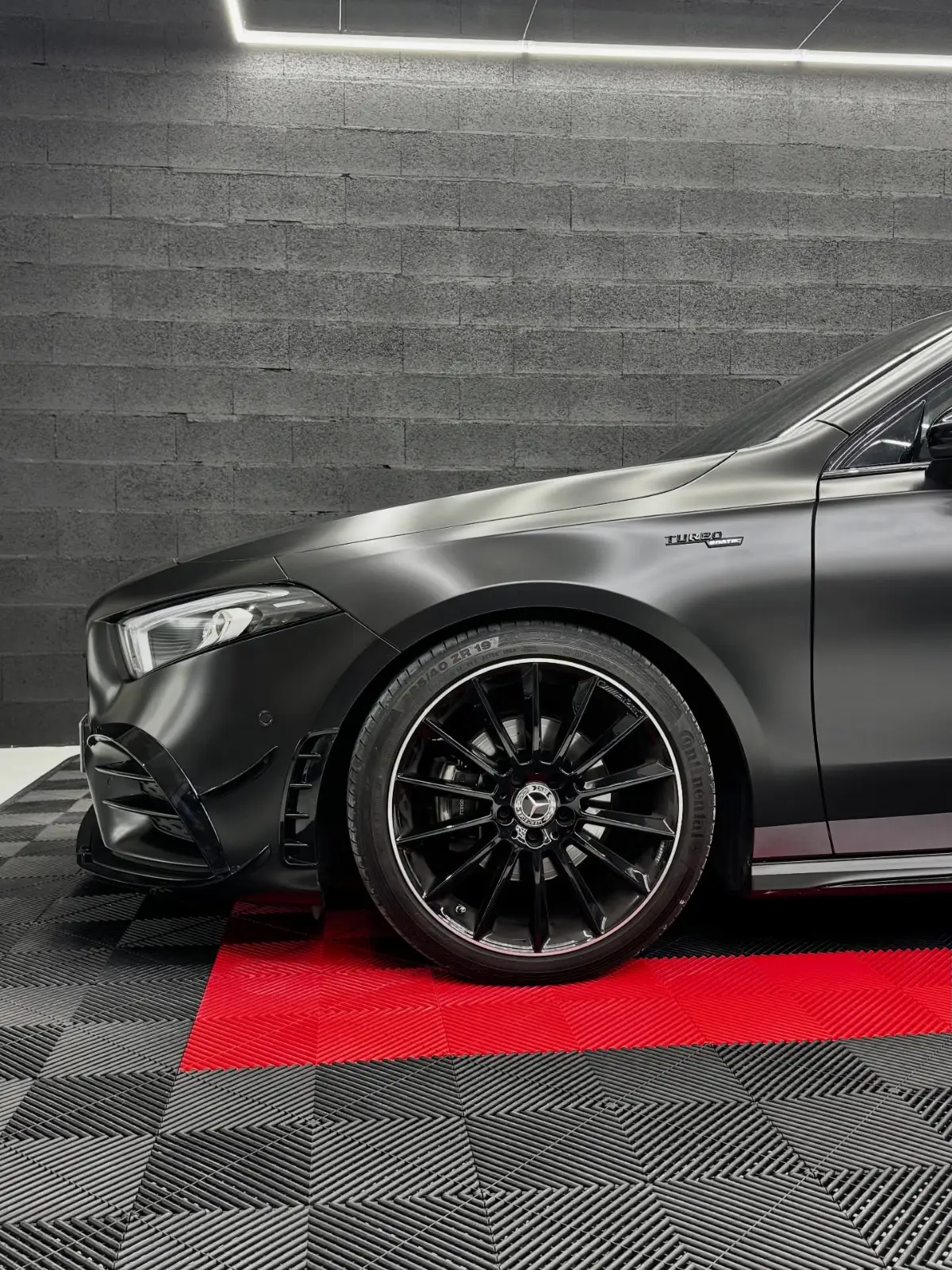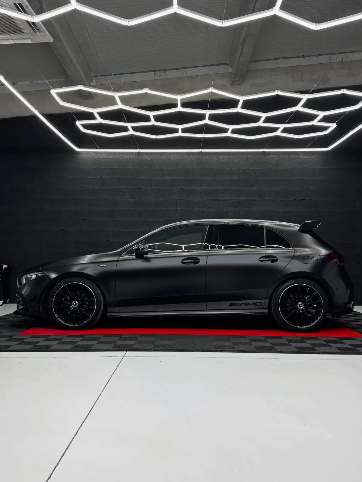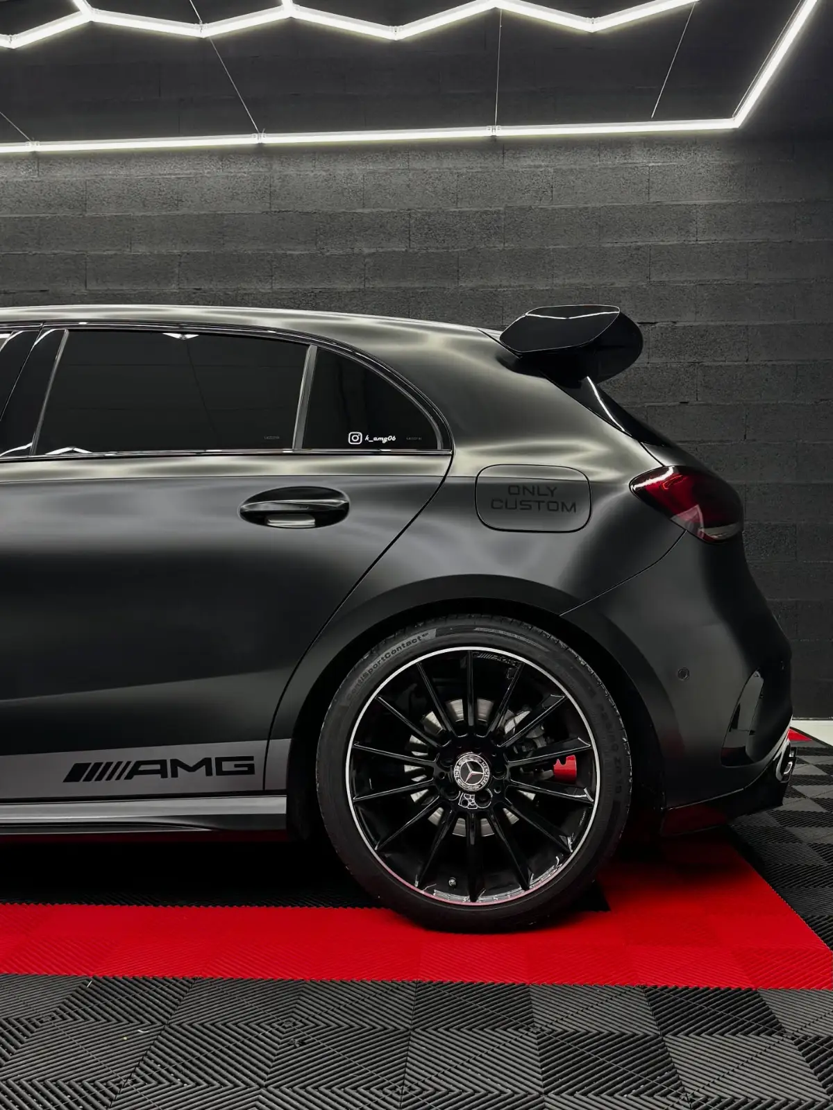 Mercedes Classe A250 Style A45S Covering Noir Satin Bandes grises personnalisées Pare brise teintée PPF brillant sur les Phares