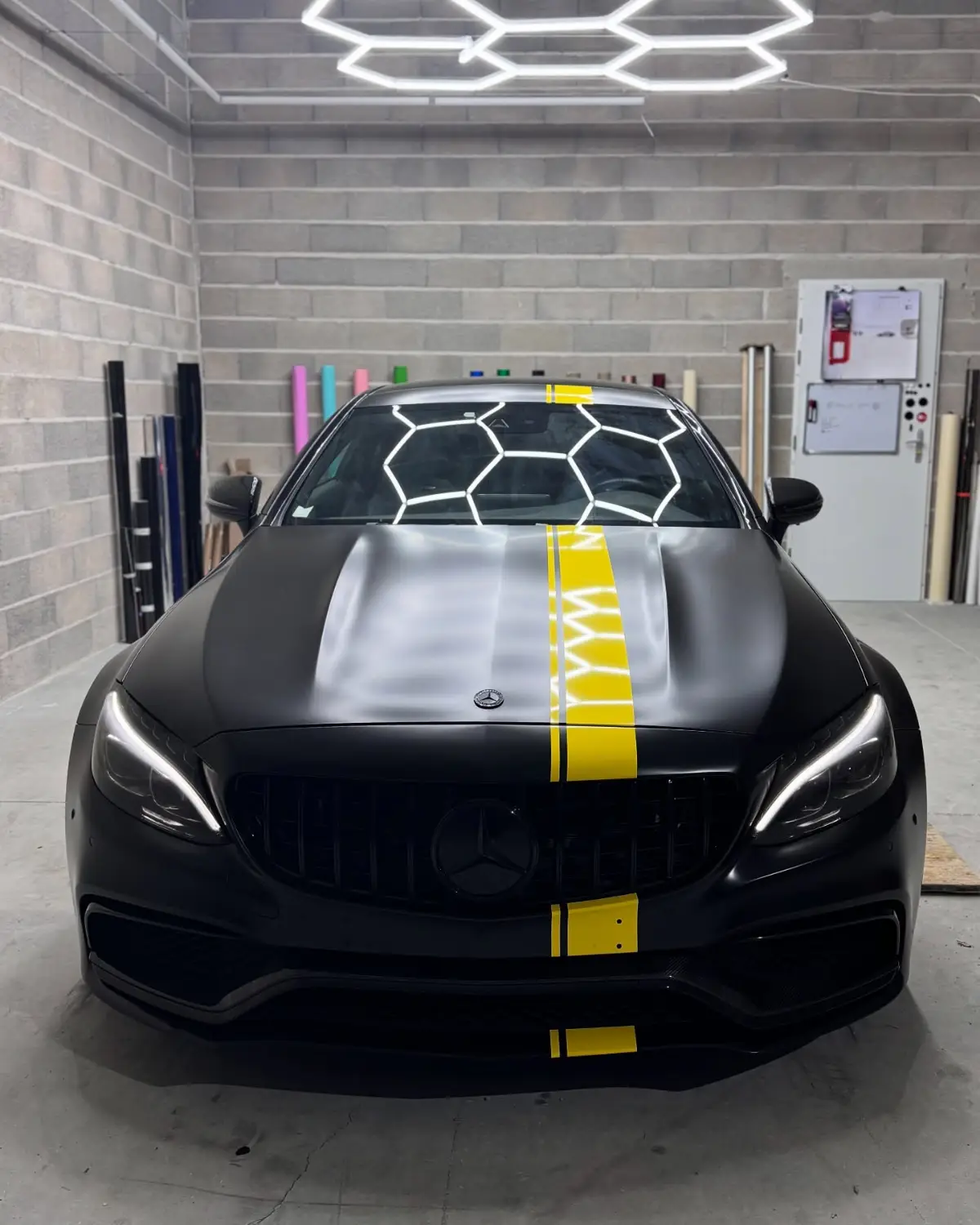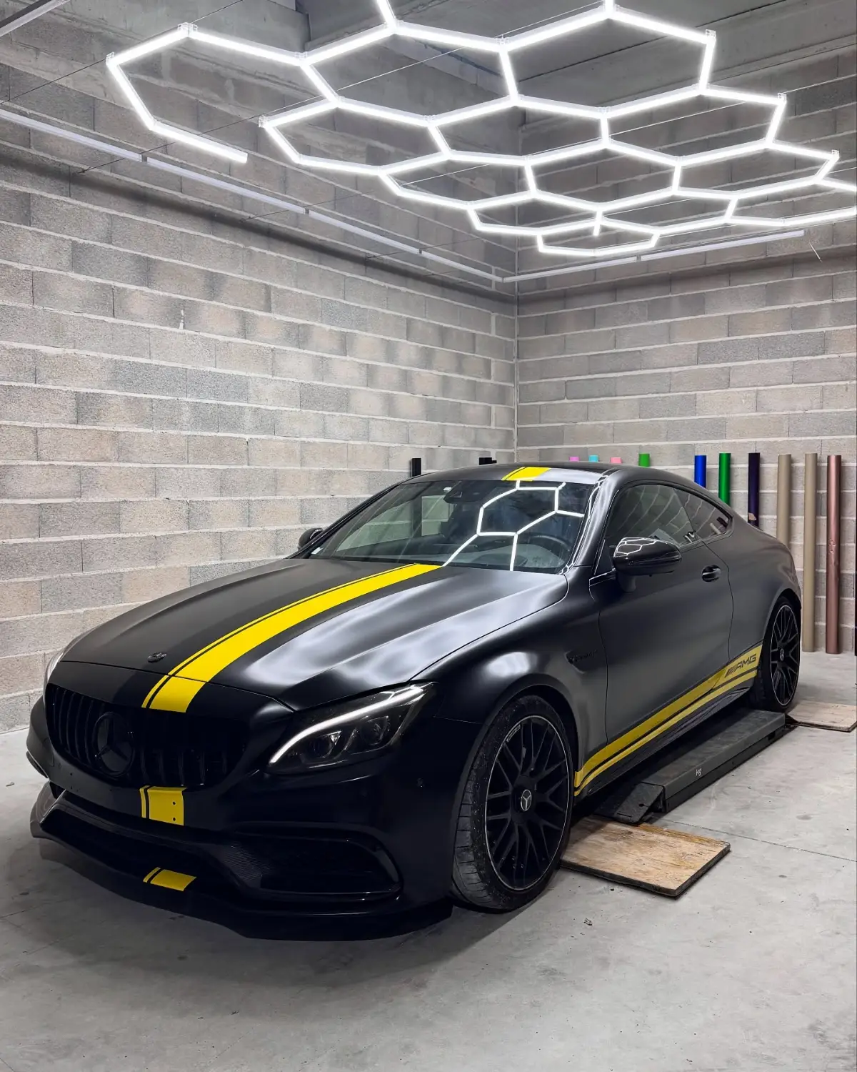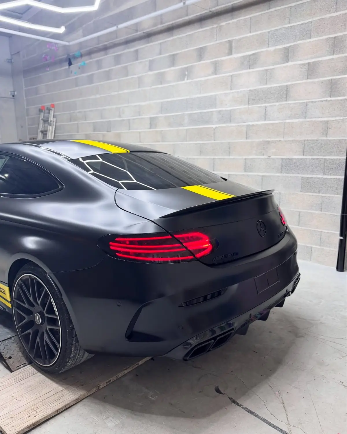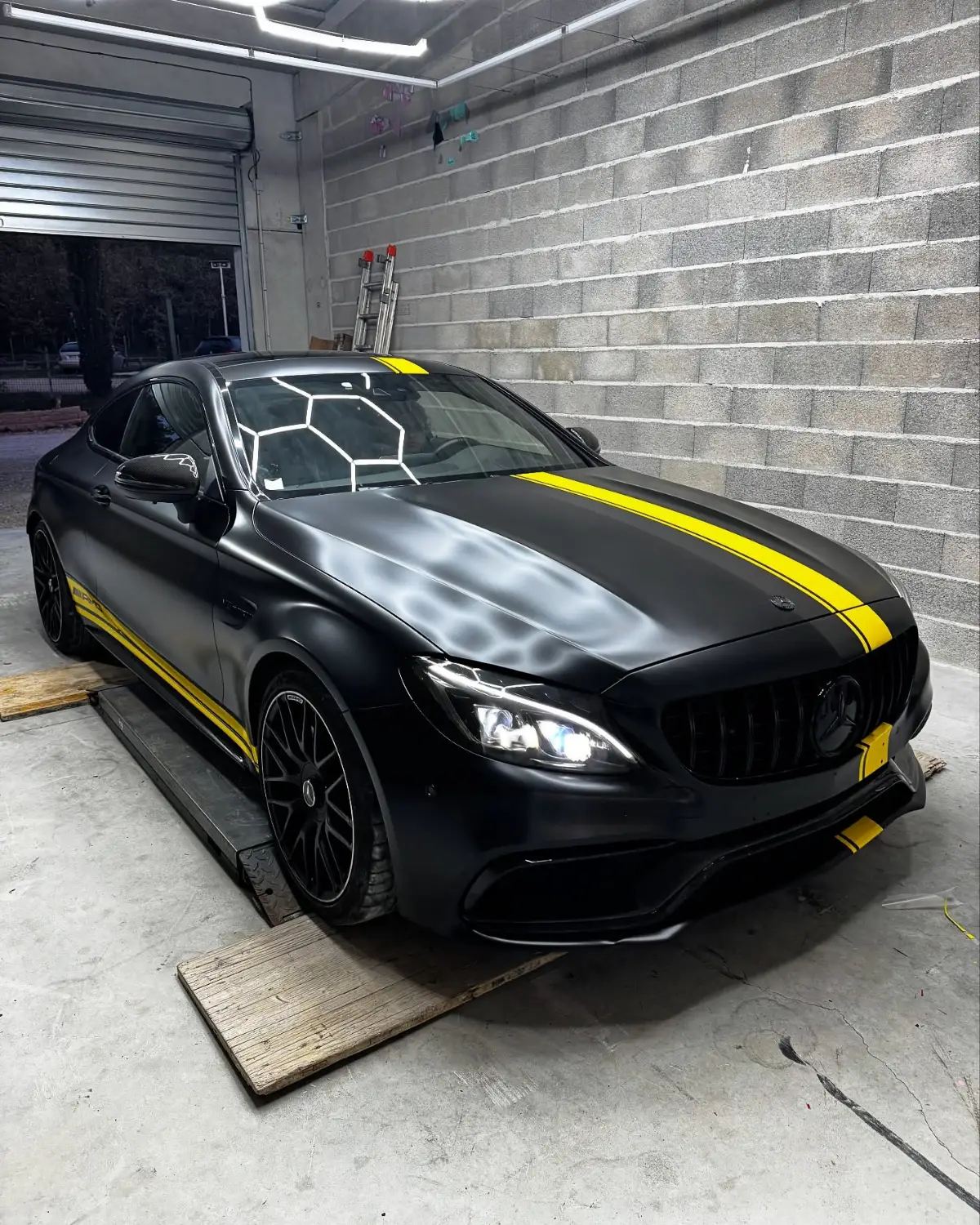 Mercedes Classe C 63 AMG Covering Noir Satin Bande Jaune Style Édition One Feux Teintés + Catadioptres